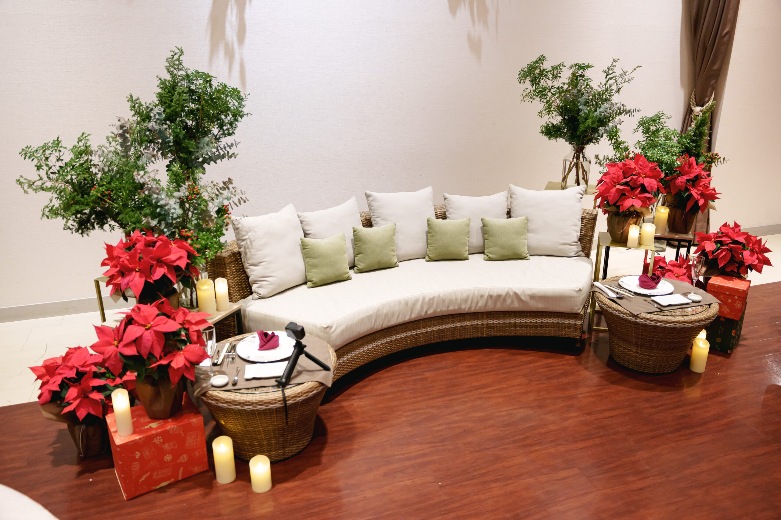 披露宴会場は、ポインセチアを取り入れたクリスマスらしい華やかなコーディネートに。