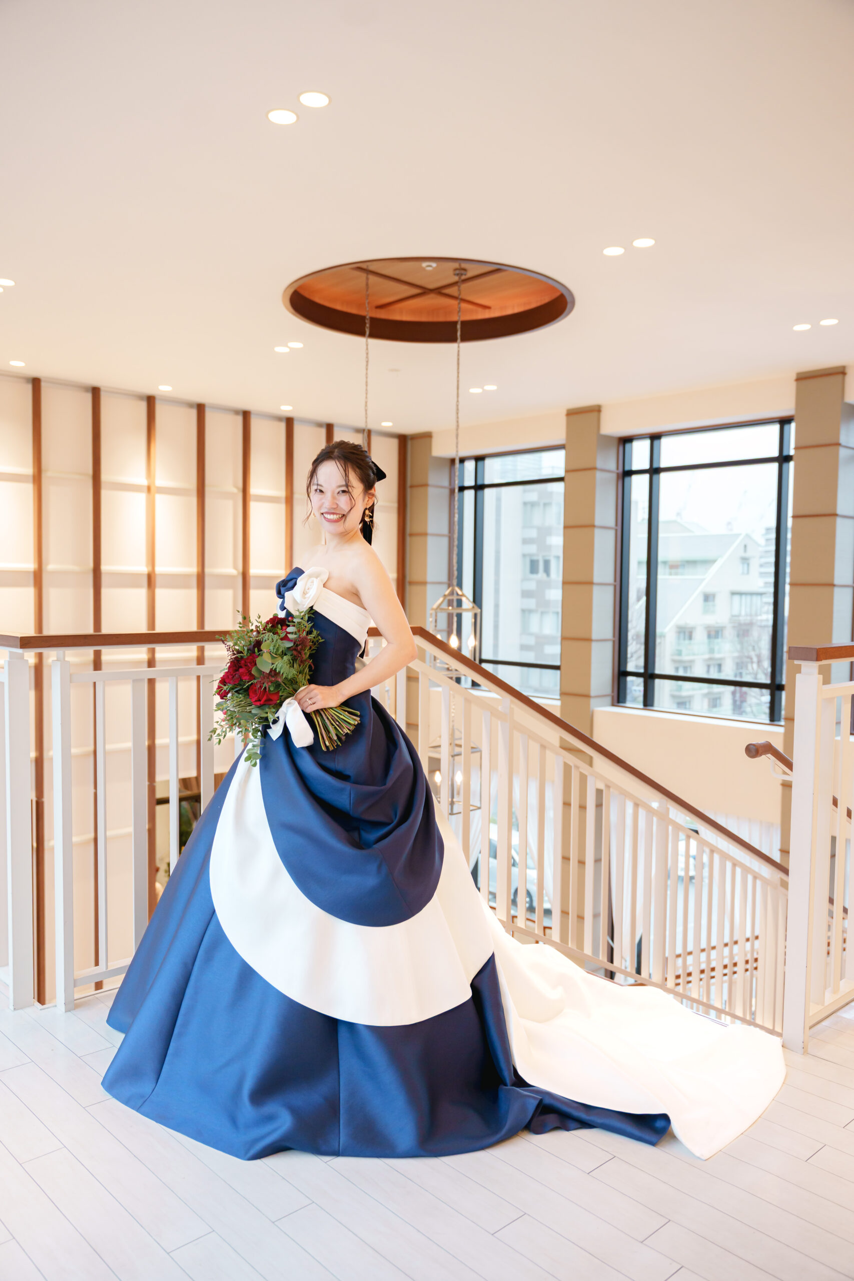 ネイビー×ホワイトの大人可愛いドレスにチェンジ。
